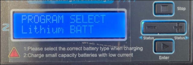 When you first start the charger, the PROGRAM SELECT screen will appear. Use the (+) and (-) buttons to select the Lithium BATT screen, then press the ▶️ button to select it. The LiPo Balance CHG screen will then appear.
