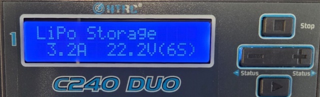 On the charger, press the ▶️ button to make the charger mode setting blink, then press the (-) or (+) button to switch from Balance CHG to Storage mode. Next, press and hold the ▶️ button to enter Storage mode.