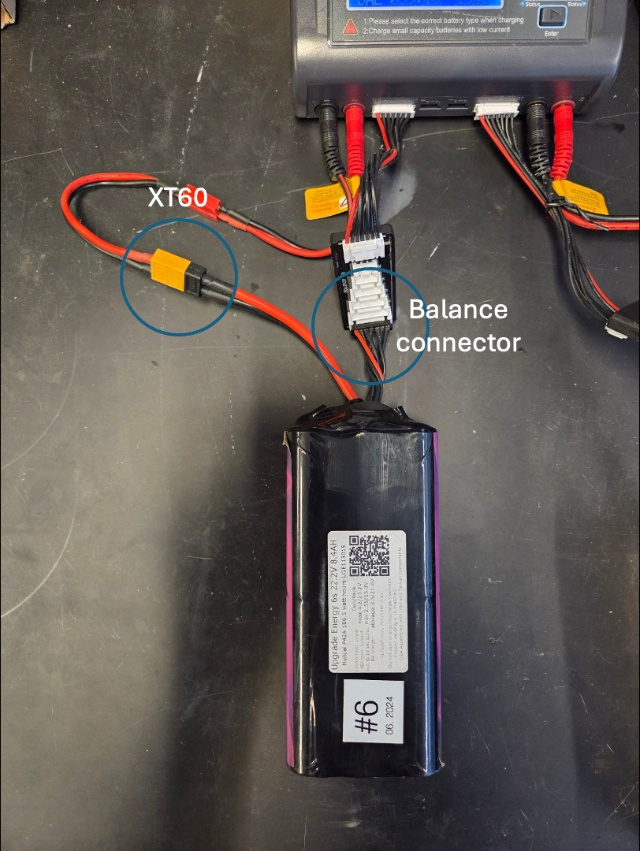 For this project, we use a charger capable of balance charging lithium polymer batteries. Balance charging means equalizing the voltage of each cell when multiple cells, such as in a 6S Lipo battery, are connected. The battery connector used is an XT60 connector.