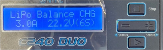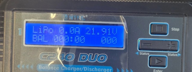 Next, connect the battery. After connecting the battery, check that the voltage setting is at 22.2V (6S). If the voltage setting is incorrectly set to 18.5 (5S) or similar, press the ▶️ button to make it blink, then set it to 22.2V (6S).