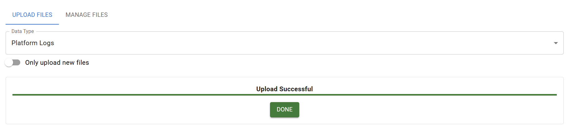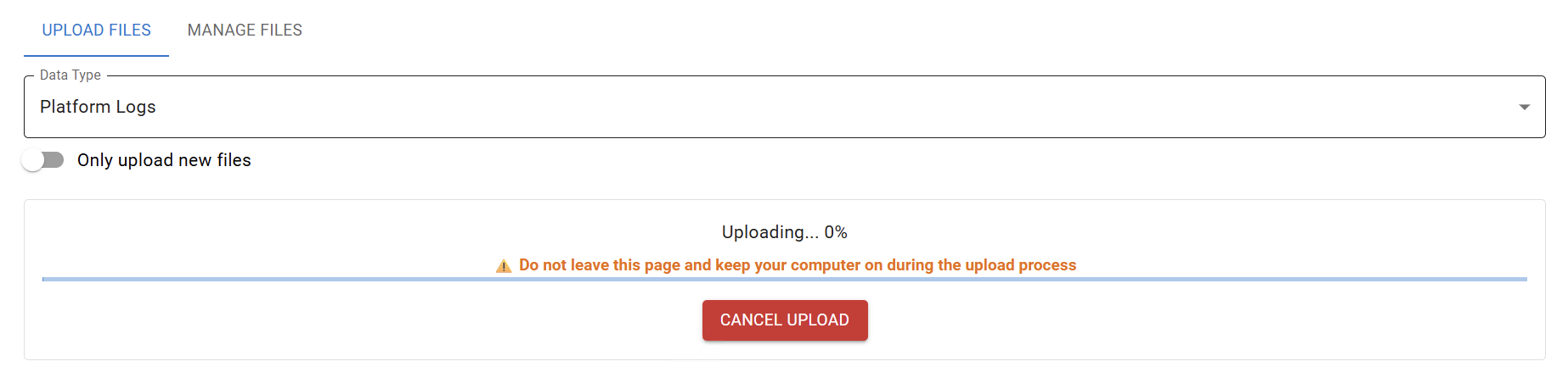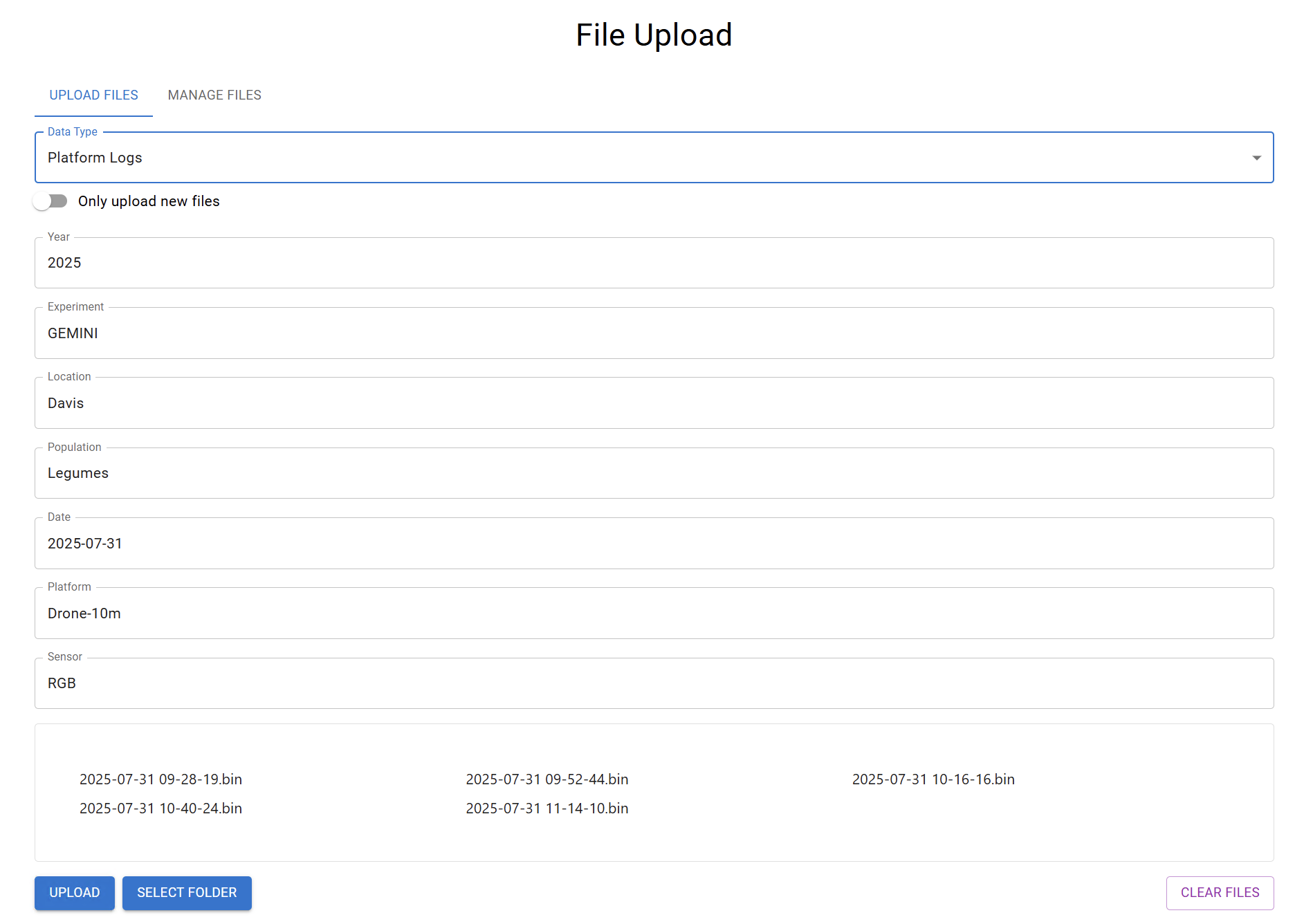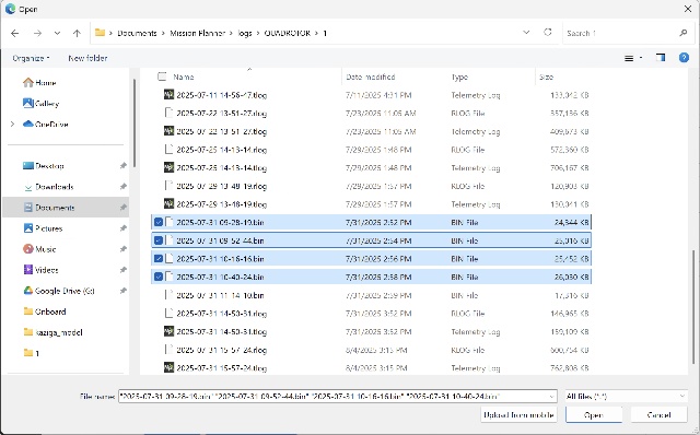 - Upload the downloaded log using the GEMINI-App. Select the logs with the extension *.bin that correspond to the date of the drone images to upload.