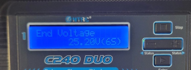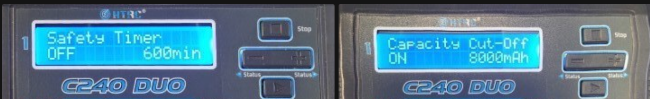 By pressing the (–) button, you can view the charging parameters. Here, you can check whether the final voltage is set appropriately, as well as how the charge capacity cut-off and charge time cut-off are configured. If you wish to change these settings, please refer to the manufacturer's user manual.