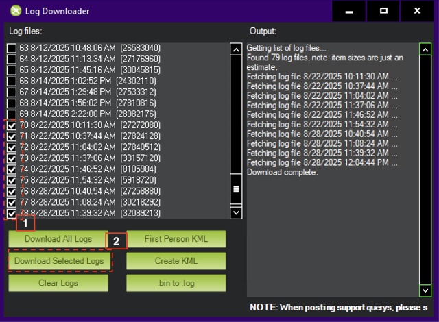 - When the Log Downloader window appears, (1) check the logs to download and (2) select Download Selected Logs to download. Check the right-side "Output:" to confirm that the log download is complete.