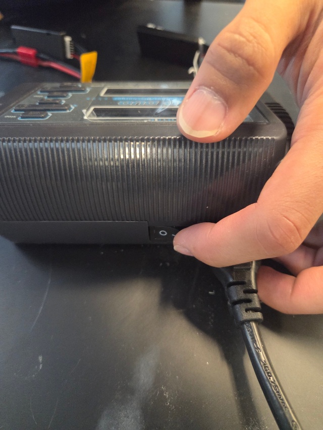 Plug the charger's main power cable into a wall outlet and turn on the power switch on the back of the main unit.